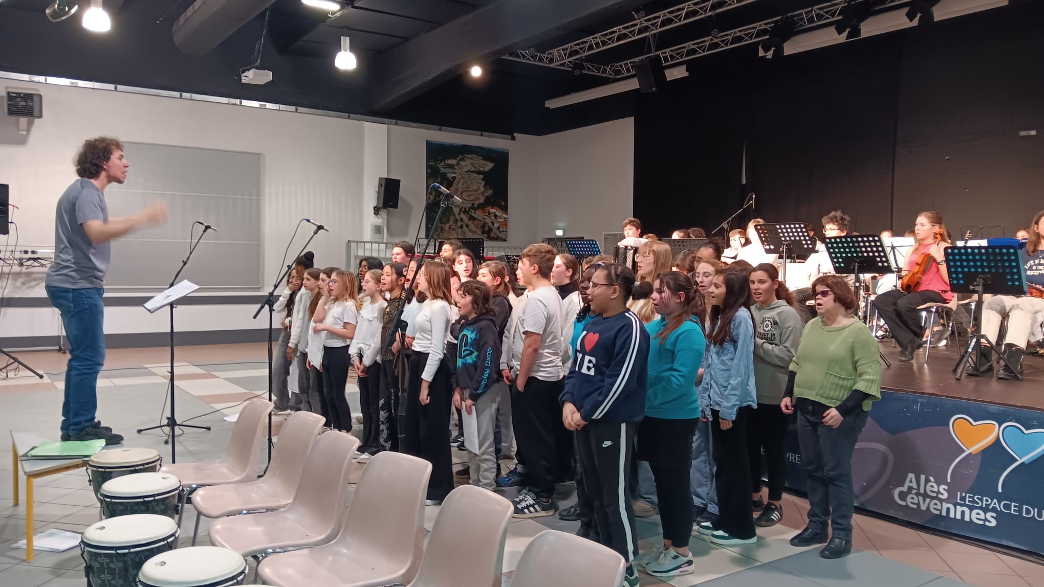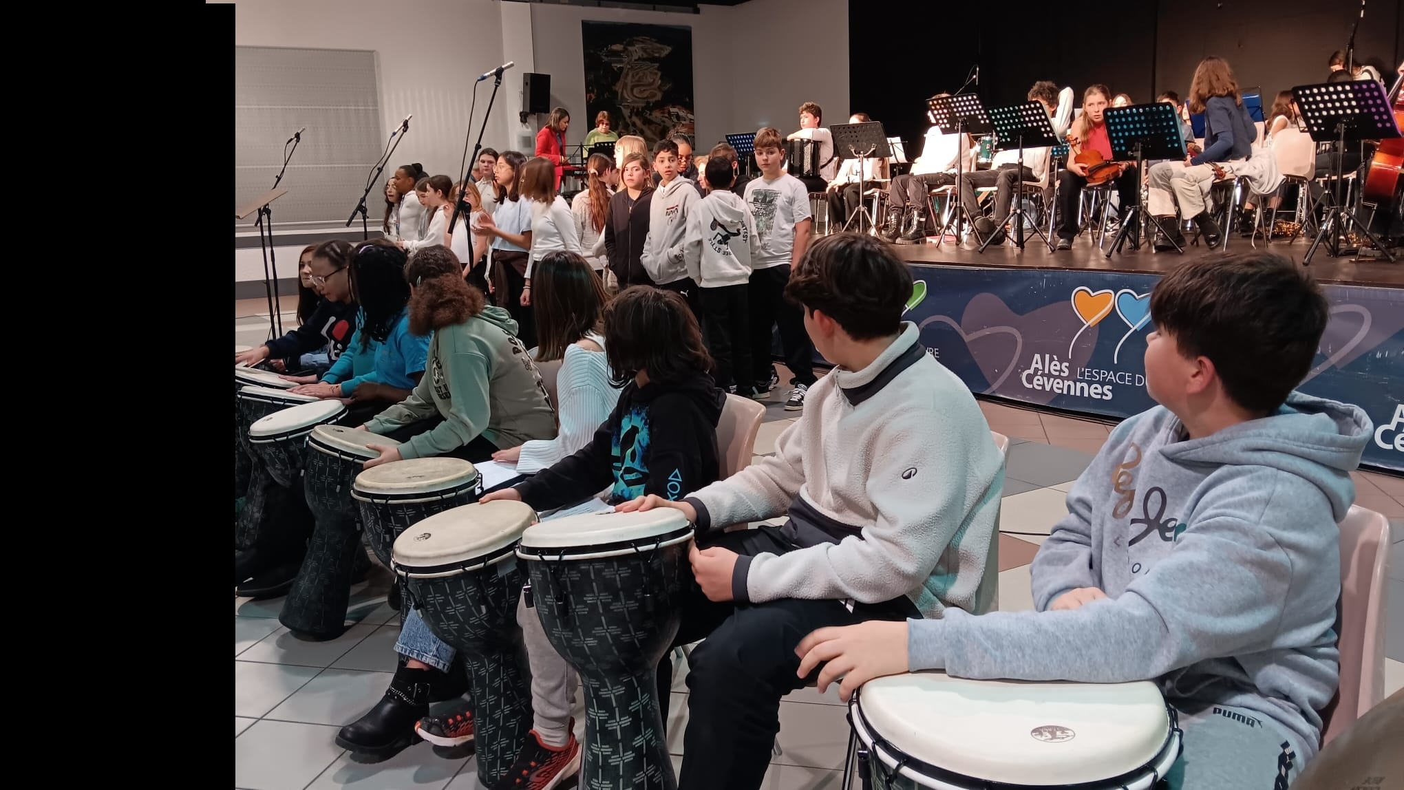 Les élèves de la chorale de Jean Moulin avec les élèves de CHAM et ULIS du collège Diderot ainsi que les classes de CE2-CM1 et CM2 de l’école élémentaire Saint Jean du Pin se sont regroupés à la salle Jules Cazot lundi 16 février pour donner une représentation réunissant l'orchestre de la CHAM et les différentes chorales.